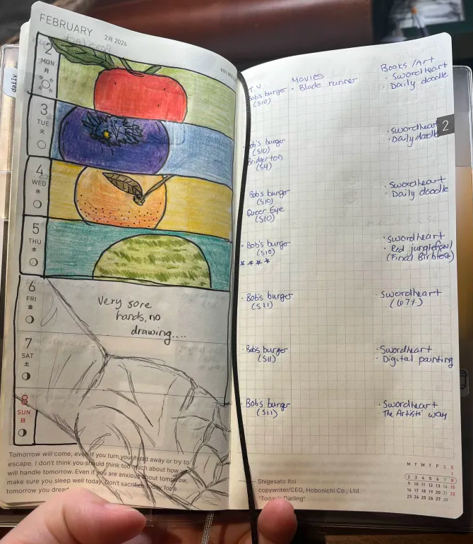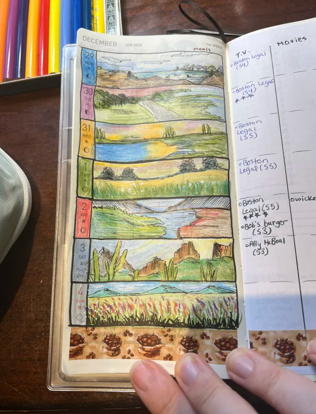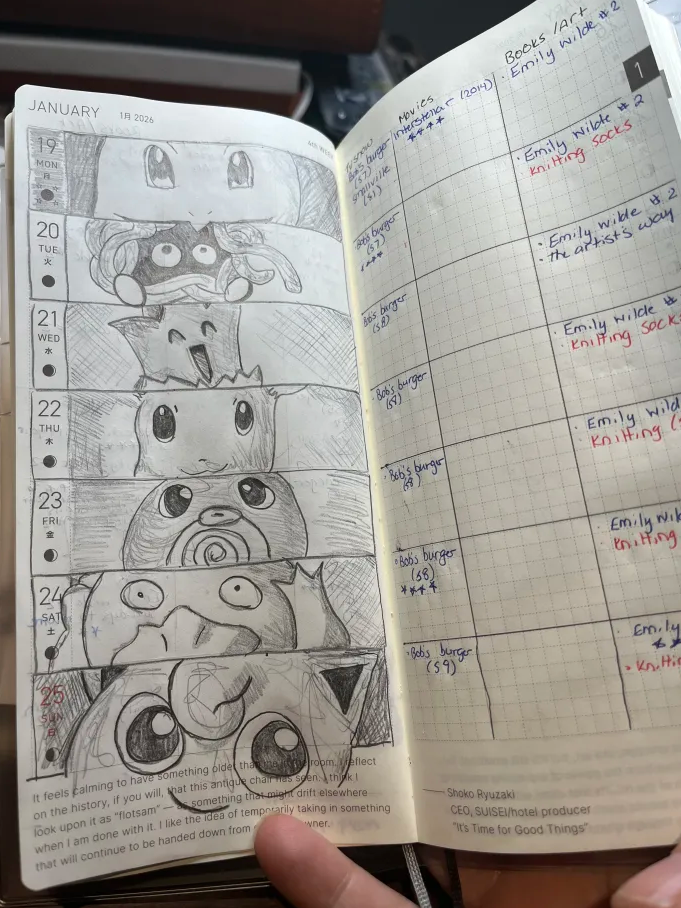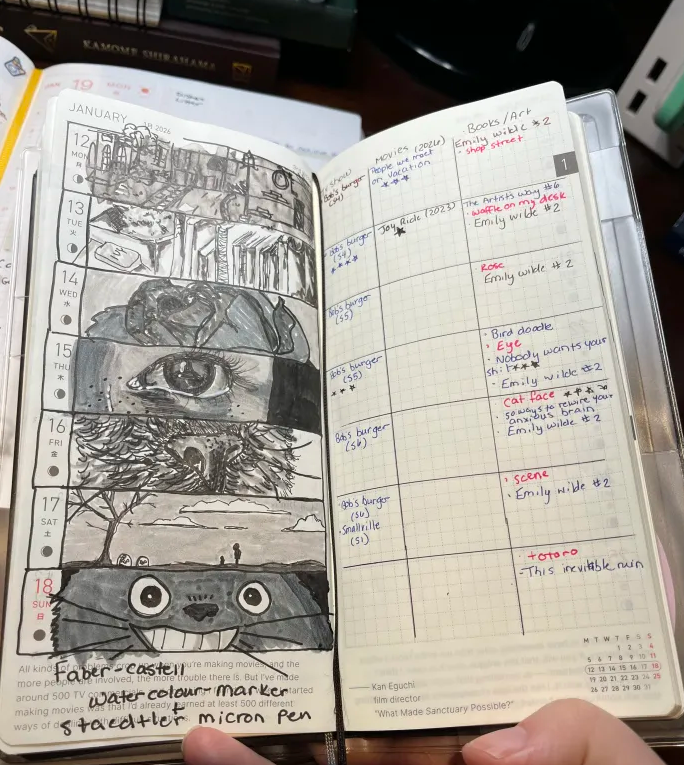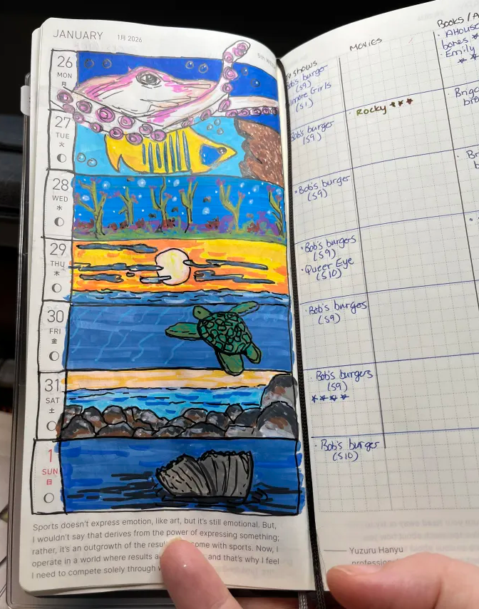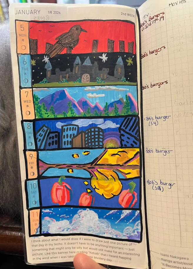 I have a hobonichi weeks for 2026 and I decided to set it up as a media journal. It tracks what books I’ve read, what TV shows (and even episodes) I’m watching, and what movies I’ve seen (barely any). I wanted a place where I could see when a new series was coming out, or any special events that were media related. I decided to add that to the right hand page, and the left hand page has wide empty sections that I’ve decided to dedicate to a ‘daily doodle’. Maybe themed, maybe using specific craft supplies, etc. I’m (at the time of this post) 17 days in, and they say it takes approximately 21 days to turn something into a habit, so I think I’m well on my way. Ideally, I’ll have a full 365 days of daily doodles in 2026. We’ll just have to see.